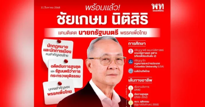 ผู้สื่อข่าวรายงานว่า เพจเฟซบุ๊กพรรคเพื่อไทย โพสต์รูปพร้อมข้อความ ระบุว่า แคนดิเดตนายกรัฐมนตรี นายชัยเกษม นิติสิริ หนึ่งในบุคคลสำคัญในแวดวงกฎหมายและการเมืองของไทย ด้วยประสบการณ์ยาวนานทั้งในฐานะอัยการสูงสุด และรัฐมนตรีว่าการกระทรวงยุติธรรม เขาได้รับการยอมรับว่าเป็นนักกฎหมายที่ยึดมั่นในหลักนิติรัฐ และเคยมีบทบาทโดยตรงในหลายเหตุการณ์สำคัญของประเทศ