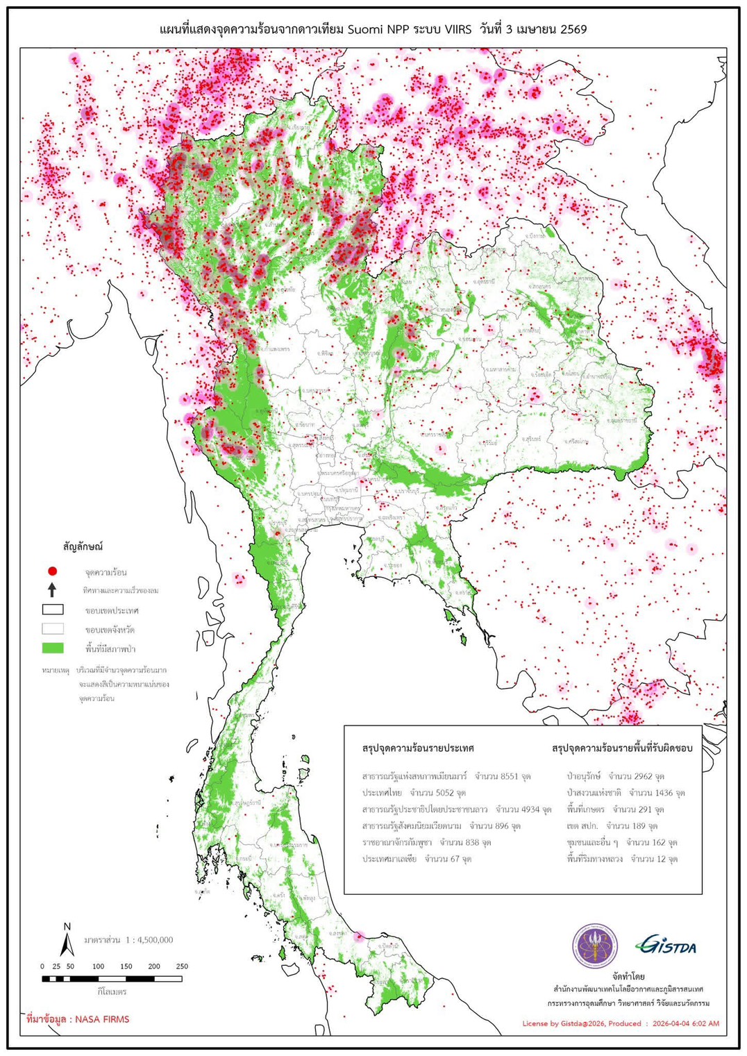 สำนักงานพัฒนาเทคโนโลยีอวกาศและภูมิสารสนเทศ (องค์การมหาชน) หรือ GISTDA รายงานข้อมูลจากดาวเทียมซูโอมิ เอ็นพีพี (Suomi NPP) ระบบ VIIRS เมื่อวันที่ 3 เมษายน 2569 พบจุดความร้อนในประเทศไทย 5,052 จุด เพิ่มขึ้นอย่างมีนัยสำคัญจากช่วงก่อนหน้า
