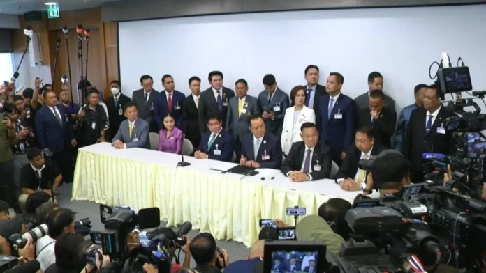 พีเพิล ยูนิตี้ นิวส์ 3 กันยายน 2568 รัฐสภา – “อนุทิน” นำ 146 สส. แถลงตั้งรัฐบาล พร้อมรับ 5 เงื่อนไข พรรคประชาชน ยุบสภาใน 4 เดือน แก้ รธน. ไม่เติมเสียง ยืนยันกระบวนการเดินหน้าเลือกนายกฯ ตามกฎหมาย ชี้สภายังอยู่ หลังเพื่อไทยยื่นยุบ